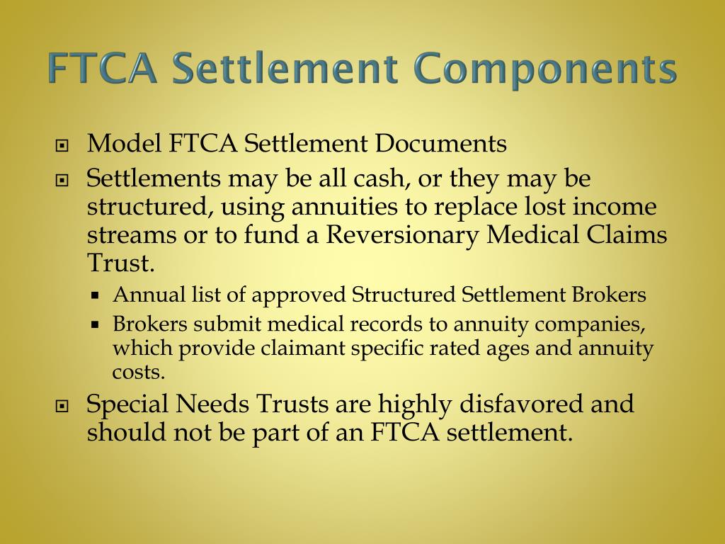 FTCA Settlement Components • Model FTCA Settlement Documents • Settlements may be all cash, or they may be structured, using annuities to replace lost income streams or to fund a Reversionary Medical Claims Trust. • Annual list of approved Structured Settlement Brokers • Brokers submit medical records to annuity companies, which provide claimant specific rated ages and annuity costs. • Special Needs Trusts are highly disfavored and should not be part of an FTCA settlement.
