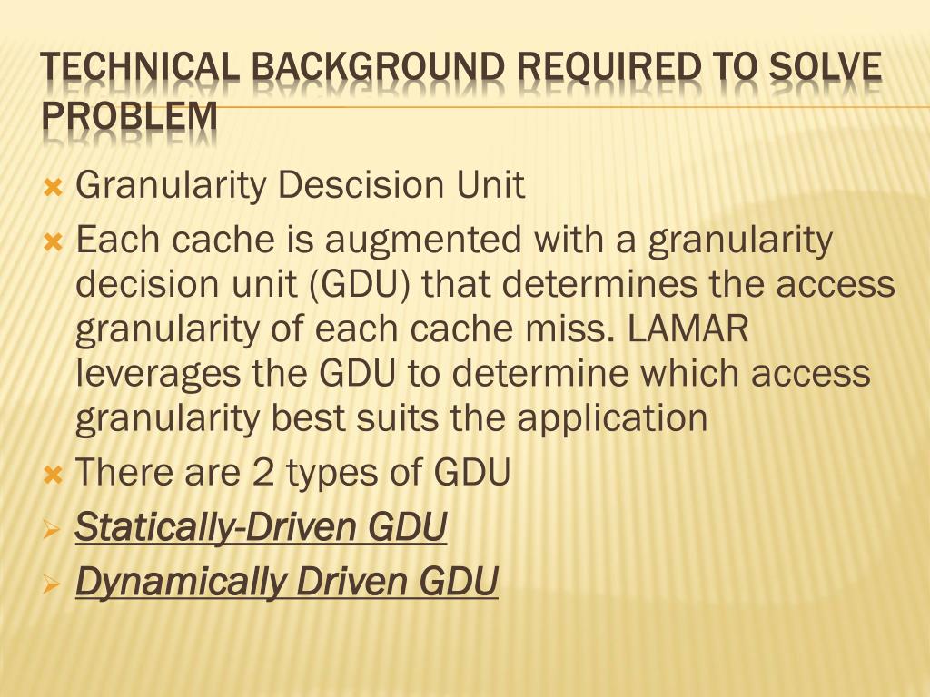 Granularity Descision Unit • Each cache is augmented with a granularity decision unit (GDU) that determines the access granularity of each cache miss. LAMAR leverages the GDU to determine which access granularity best suits the application • There are 2 types of GDU • Statically-Driven GDU • Dynamically Driven GDU TECHNICAL BACKGROUND REQUIRED TO SOLVE PROBLEM
