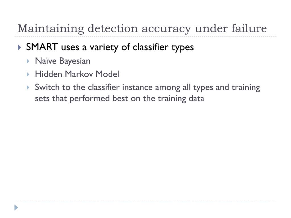 Maintaining detection accuracy under failure • SMART uses a variety of classifier types • Naïve Bayesian • Hidden Markov Model • Switch to the classifier instance among all types and training sets that performed best on the training data