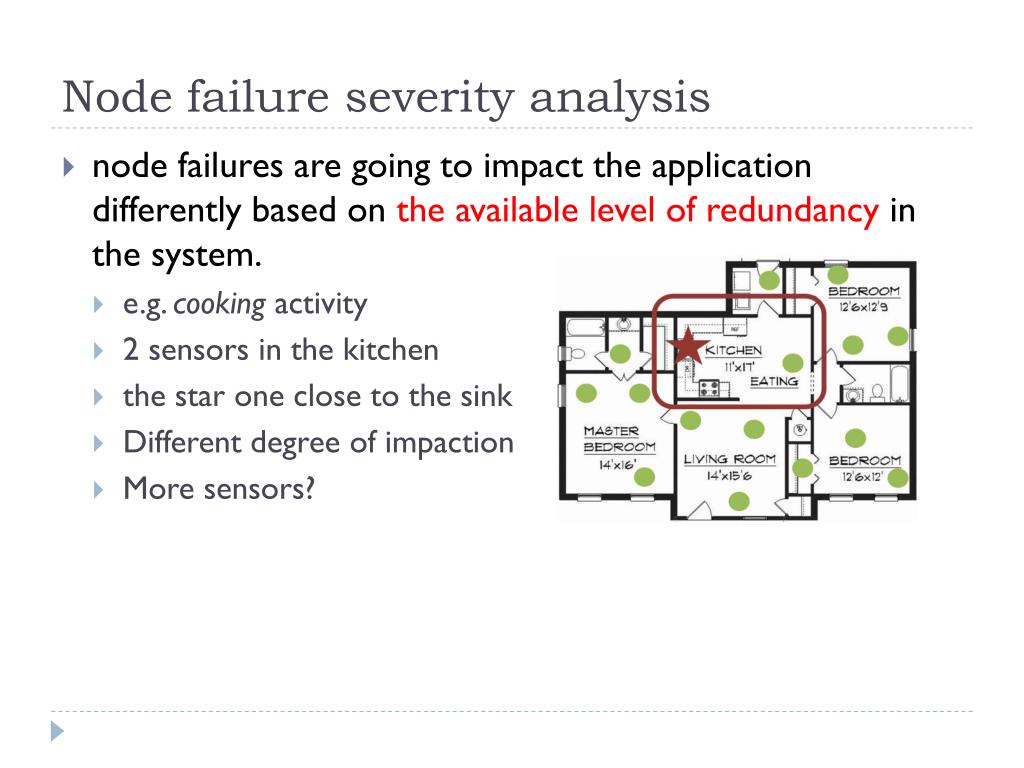 Node failure severity analysis • node failures are going to impact the application differently based on the available level of redundancy in the system. • e.g. cooking activity • 2 sensors in the kitchen • the star one close to the sink • Different degree of impaction • More sensors?