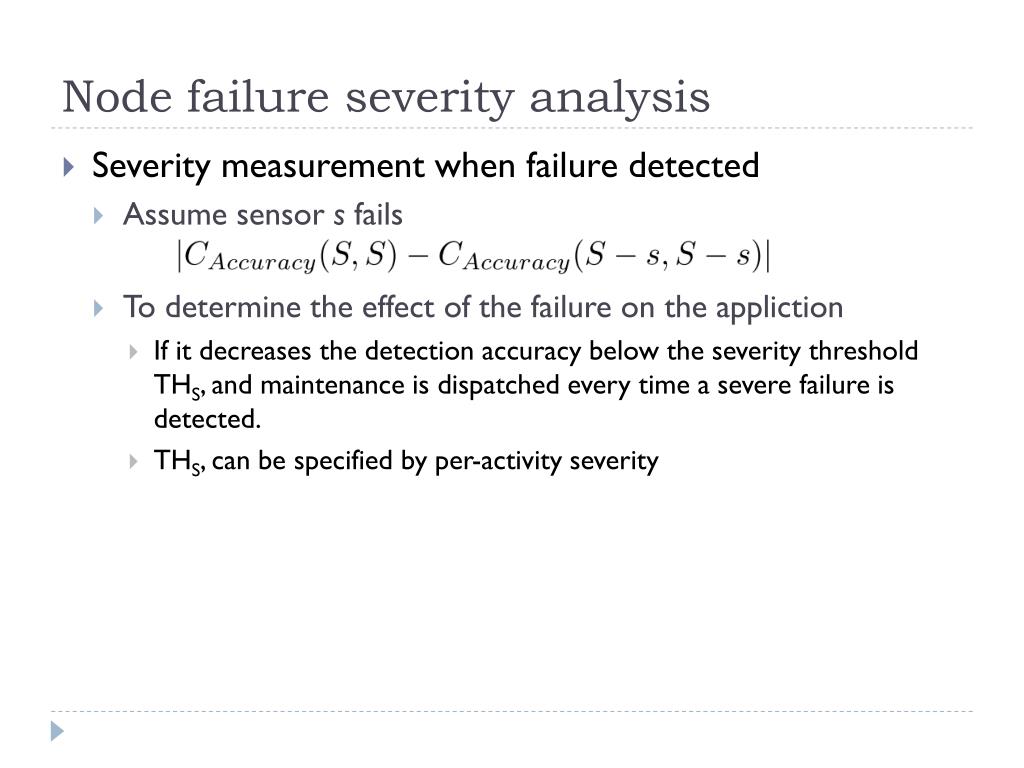 Node failure severity analysis • Severity measurementwhen failure detected • Assume sensor s fails • To determine the effect of the failure on the appliction • If it decreases the detection accuracy below the severity threshold THS, and maintenance is dispatched every time a severe failure is detected. • THS, can be specified by per-activity severity