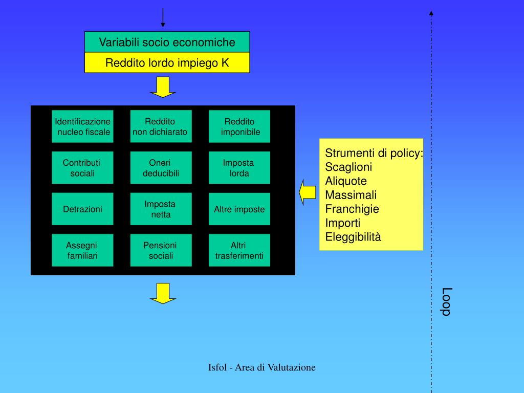 Variabili socio economiche Reddito lordo impiego K Reddito non dichiarato Identificazione nucleo fiscale Reddito imponibile Strumenti di policy: Scaglioni Aliquote Massimali Franchigie Importi Eleggibilità Contributi sociali Oneri deducibili Imposta lorda Detrazioni Imposta netta Altre imposte Assegni familiari Pensioni sociali Altri trasferimenti Loop Isfol - Area di Valutazione