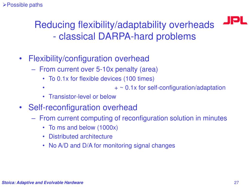 Possible paths Reducing flexibility/adaptability overheads - classical DARPA-hard problems • Flexibility/configuration overhead • From current over 5-10x penalty (area) • To 0.1x for flexible devices (100 times) • + ~ 0.1x for self-configuration/adaptation • Transistor-level or below • Self-reconfiguration overhead • From current computing of reconfiguration solution in minutes • To ms and below (1000x) • Distributed architecture • No A/D and D/A for monitoring signal changes 27