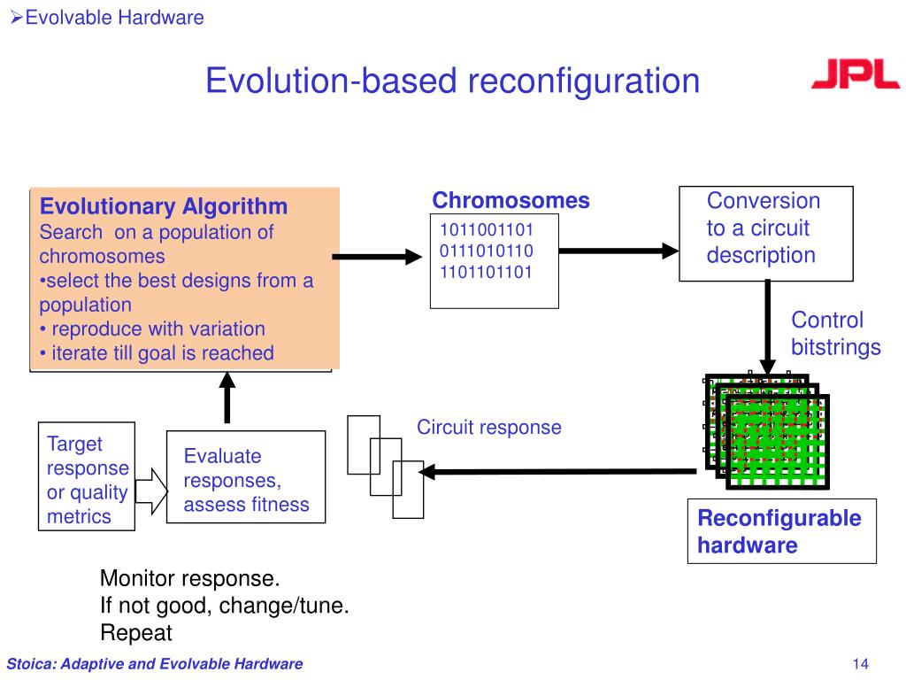 Evolvable Hardware Implementing reconfiguration algorithms • Model-based: • Memory-based: predetermined contexts stored in memory configurations that correspond to various contexts; • Calculate an (analytic) solution • Search-based, HW in the loop: • Gradient-based search/optimization guides reconfiguration to increasingly better performance; • Population-based search (e.g. using evolutionary algorithms)- if there is no predetermination and no simple change algorithm • Limitations: • it is computationally intensive • may go through states which are actually worse that where it was started and can potentially harm the system if control is maintained from the reconfigurable analog area. 13