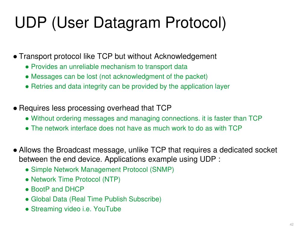 UDP (User Datagram Protocol) • Transport protocol like TCP but without Acknowledgement • Provides an unreliable mechanism to transport data • Messages can be lost (not acknowledgment of the packet) • Retries and data integrity can be provided by the application layer • Requires less processing overhead that TCP • Without ordering messages and managing connections. it is faster than TCP • The network interface does not have as much work to do as with TCP • Allows the Broadcast message, unlike TCP that requires a dedicated socket between the end device. Applications example using UDP : • Simple Network Management Protocol (SNMP) • Network Time Protocol (NTP) • BootP and DHCP • Global Data (Real Time Publish Subscribe) • Streaming video i.e. YouTube