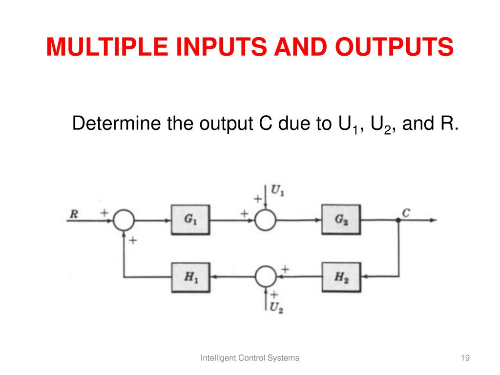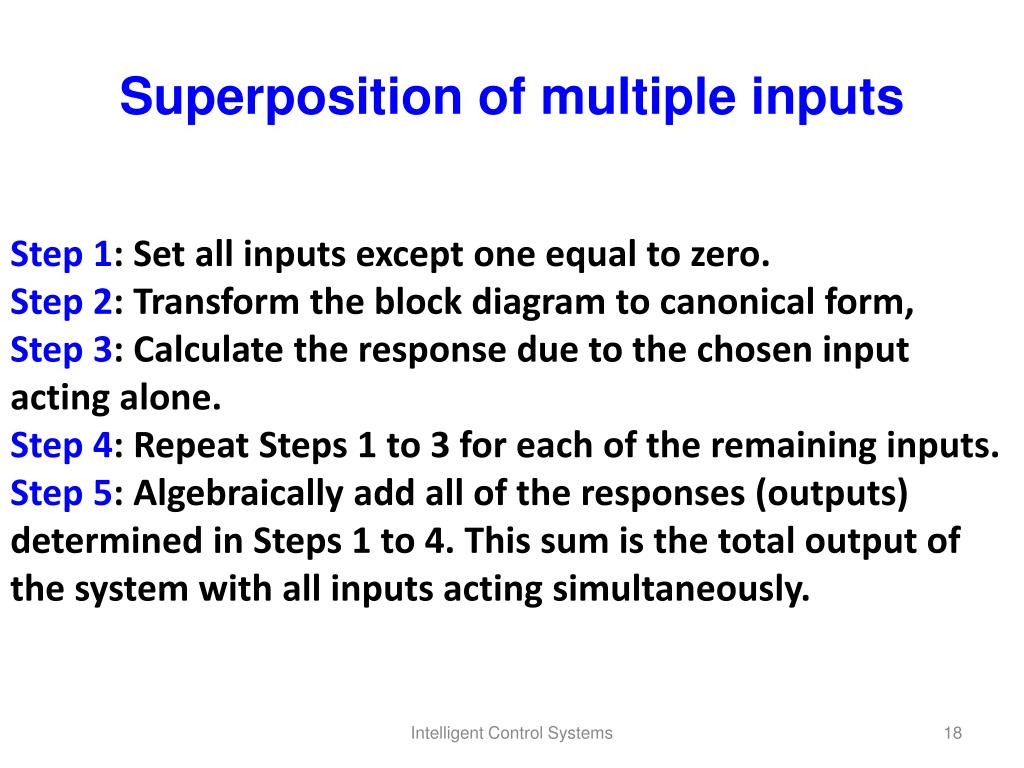 Superposition of multiple inputs Step 1: Set all inputs except one equal to zero. Step 2: Transform the block diagram to canonical form, Step 3: Calculate the response due to the chosen input acting alone. Step 4: Repeat Steps 1 to 3 for each of the remaining inputs. Step 5: Algebraically add all of the responses (outputs) determined in Steps 1 to 4. This sum is the total output of the system with all inputs acting simultaneously. Intelligent Control Systems