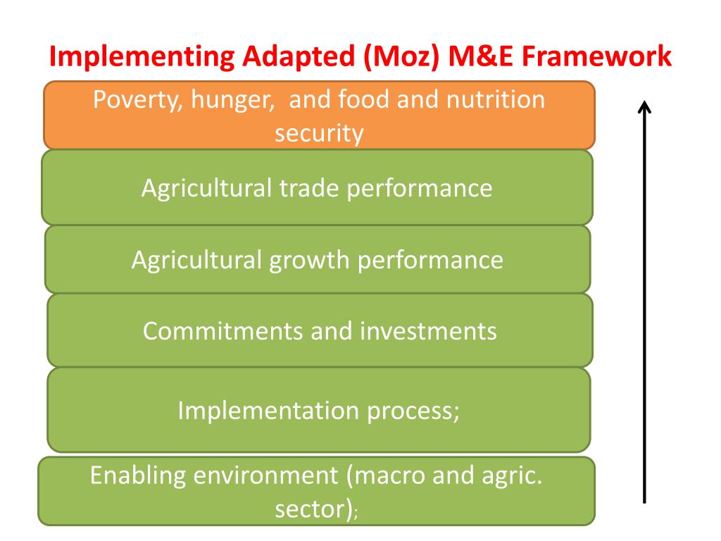 Implementing Adapted (Moz) M&E Framework Poverty, hunger, and food and nutrition security Agricultural trade performance Agricultural growth performance Commitments and investments Implementation process; Enabling environment (macro and agric. sector);
