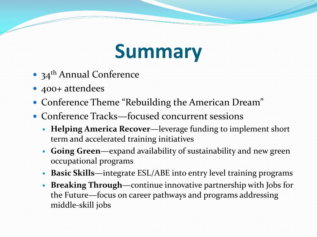 Summary • 34th Annual Conference • 400+ attendees • Conference Theme “Rebuilding the American Dream” • Conference Tracks—focused concurrent sessions • Helping America Recover—leverage funding to implement short term and accelerated training initiatives • Going Green—expand availability of sustainability and new green occupational programs • Basic Skills—integrate ESL/ABE into entry level training programs • Breaking Through—continue innovative partnership with Jobs for the Future—focus on career pathways and programs addressing middle-skill jobs
