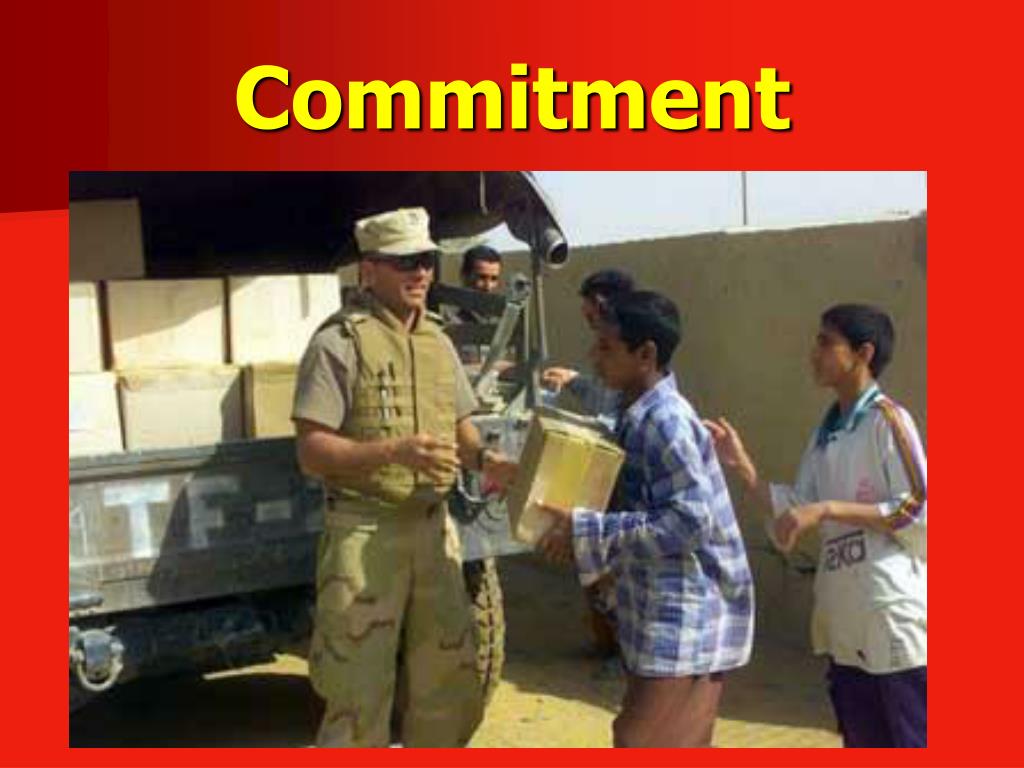 Core Values • COMMITMENT -The promise or pledge to complete a worthy goal by worthy means which requires identification with that goal and demonstrated actions to support that goal, including, but not limited to: • Competence. Maintaining, and improving one's skill level to support the team. Commitment to growing toward a standard of excellence second to none. • Teamwork. Individual effort in support of other team members in accomplishing the team's mission. Marines take care of their own. • Selflessness. Marines take care of their subordinates, their families, their fellow Marines before themselves. The welfare of our country and our Corps is more important than our individual welfare.