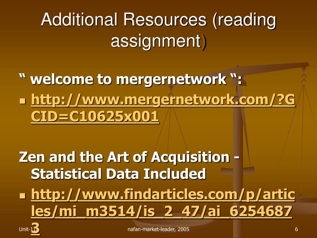Additional Resources (reading assignment) “ welcome to mergernetwork “: • http://www.mergernetwork.com/?GCID=C10625x001 Zen and the Art of Acquisition - Statistical Data Included • http://www.findarticles.com/p/articles/mi_m3514/is_2_47/ai_62546873 nafan-market-leader, 2005