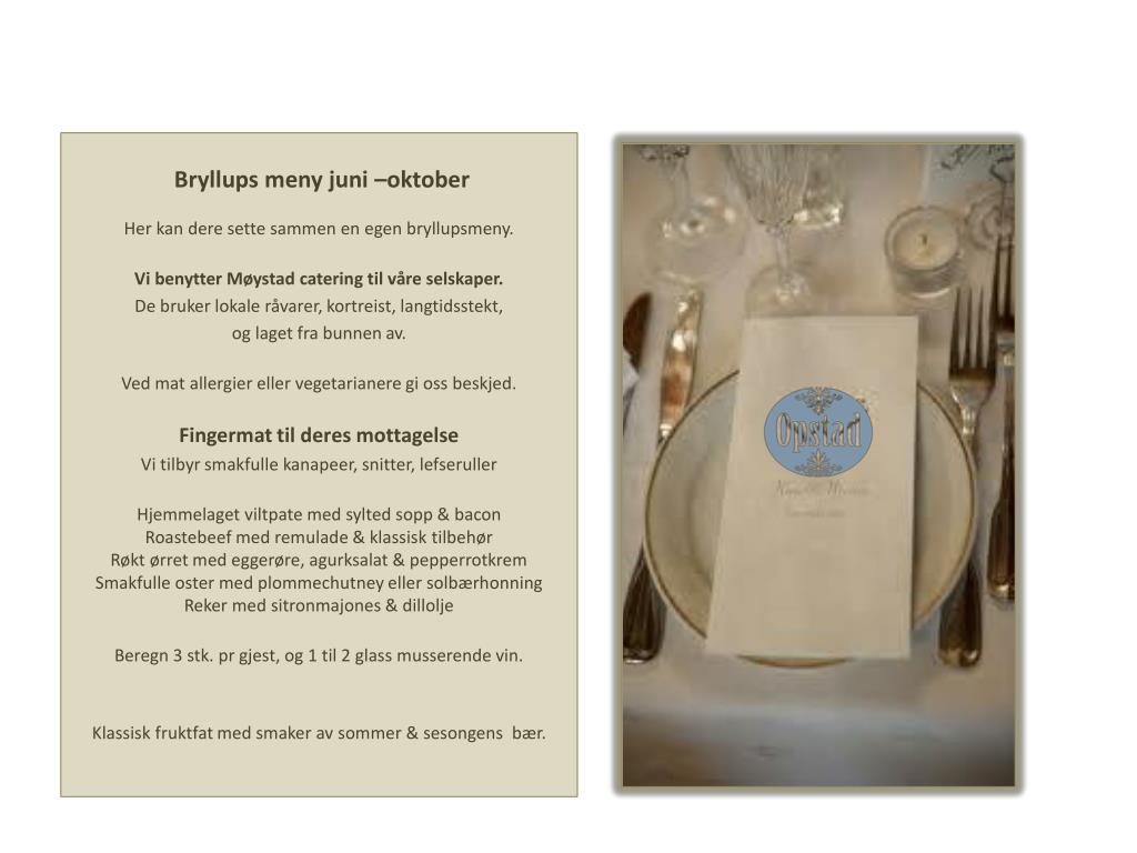 Bryllups meny juni –oktober • Her kan dere sette sammen en egen bryllupsmeny. • Vi benytter Møystad catering til våre selskaper. • De bruker lokale råvarer, kortreist, langtidsstekt, • og laget fra bunnen av. • Ved mat allergier eller vegetarianeregi oss beskjed. • Fingermat til deres mottagelse • Vi tilbyr smakfulle kanapeer, snitter, lefseruller • Hjemmelaget viltpate med sylted sopp & baconRoastebeefmed remulade & klassisk tilbehørRøkt ørret med eggerøre, agurksalat & pepperrotkremSmakfulle oster med plommechutney eller solbærhonningReker med sitronmajones & dillolje • Beregn3 stk. pr gjest, og 1 til 2 glass musserende vin. • Klassisk fruktfat med smaker av sommer & sesongens bær.