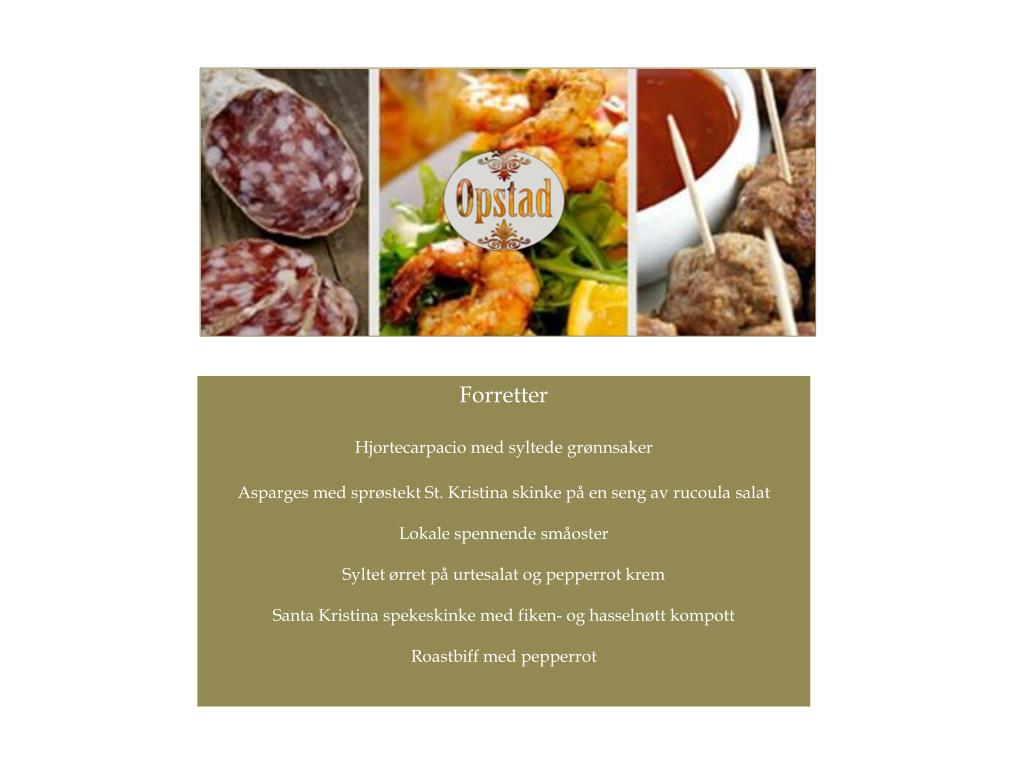Forretter Hjortecarpaciomed syltede grønnsaker Asparges med sprøstekt St. Kristina skinke på en seng av rucoula salatLokale spennende småoster Syltet ørret på urtesalat og pepperrot kremSanta Kristina spekeskinke med fiken- og hasselnøtt kompottRoastbiff med pepperrot