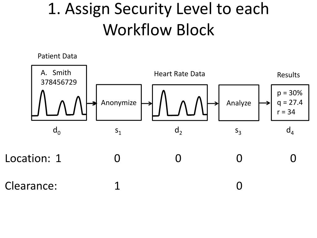 1. Assign Security Level to each Workflow Block Patient Data Heart Rate Data Results Smith 378456729 Anonymize Analyze p = 30% q = 27.4 r = 34 d0 s1 d2 s3 d4 Location:10000 Clearance:10