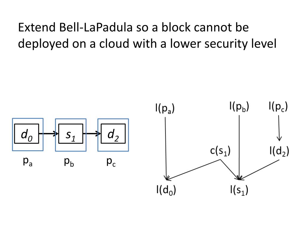 Extend Bell-LaPadula so a block cannot be deployed on a cloud with a lower security level d2 d0 s1 pa pb pc