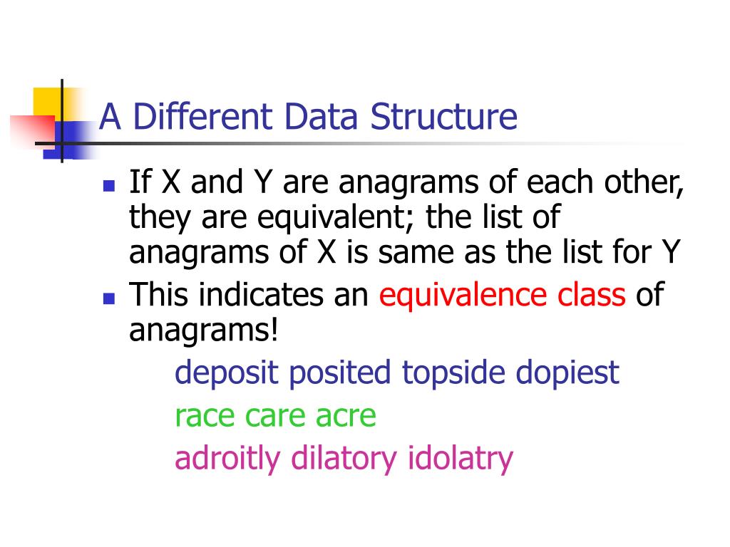 A Different Data Structure • If X and Y are anagrams of each other, they are equivalent; the list of anagrams of X is same as the list for Y • This indicates an equivalence class of anagrams! deposit posited topside dopiest race care acre adroitly dilatory idolatry