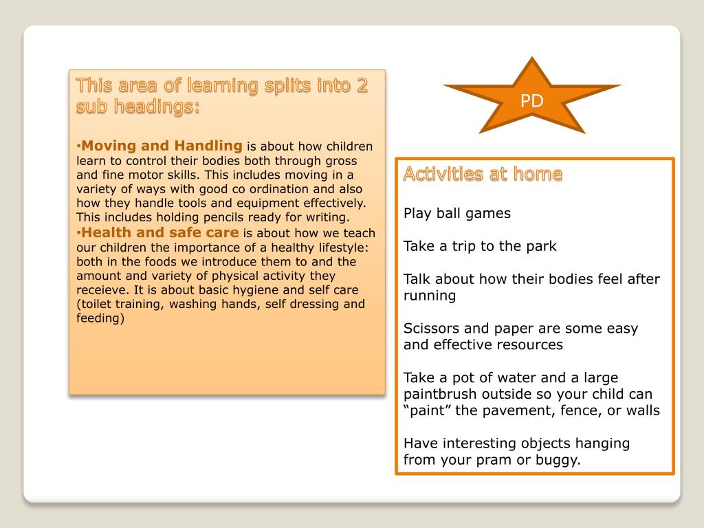 PD • This area of learning splits into 2 sub headings: • Moving and Handling is about how children learn to control their bodies both through gross and fine motor skills. This includes moving in a variety of ways with good co ordination and also how they handle tools and equipment effectively. This includes holding pencils ready for writing. • Health and safe careis about how we teach our children the importance of a healthy lifestyle: both in the foods we introduce them to and the amount and variety of physical activity they receieve. It is about basic hygiene and self care (toilet training, washing hands, self dressing and feeding) Activities at home Play ball games Take a trip to the park Talk about how their bodies feel after running Scissors and paper are some easy and effective resources Take a pot of water and a large paintbrush outside so your child can “paint” the pavement, fence, or walls Have interesting objects hanging from your pram or buggy.