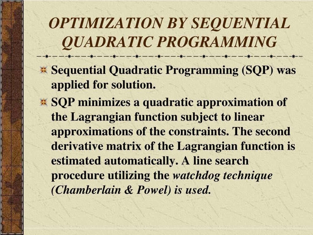 OPTIMIZATION BY SEQUENTIAL QUADRATIC PROGRAMMING • Sequential Quadratic Programming (SQP) was applied for solution. • SQP minimizes a quadratic approximation of the Lagrangian function subject to linear approximations of the constraints. The second derivative matrix of the Lagrangian function is estimated automatically. A line search procedure utilizing the watchdog technique (Chamberlain & Powel) is used.