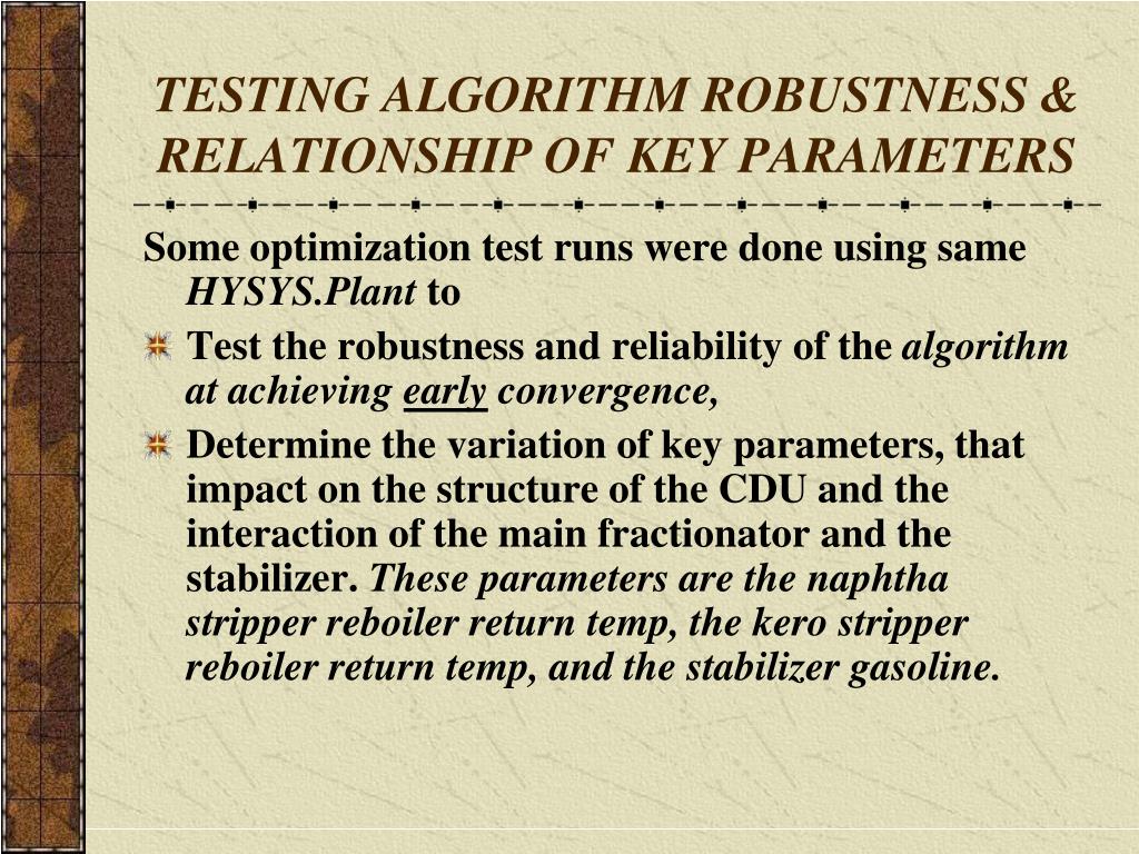 TESTING ALGORITHM ROBUSTNESS & RELATIONSHIP OF KEY PARAMETERS Some optimization test runs were done using same HYSYS.Plant to • Test the robustness and reliability of the algorithm at achieving early convergence, • Determine the variation of key parameters, that impact on the structure of the CDU and the interaction of the main fractionator and the stabilizer. These parameters are the naphtha stripper reboiler return temp, the kero stripper reboiler return temp, and the stabilizer gasoline.
