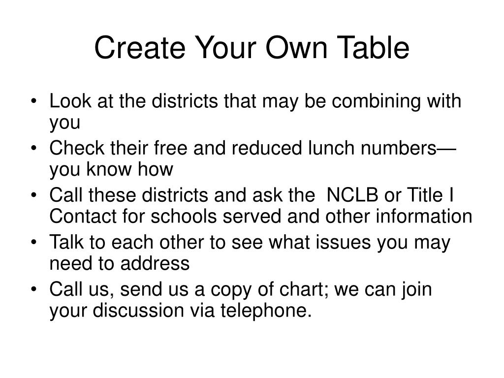 Create Your Own Table • Look at the districts that may be combining with you • Check their free and reduced lunch numbers—you know how • Call these districts and ask the NCLB or Title I Contact for schools served and other information • Talk to each other to see what issues you may need to address • Call us, send us a copy of chart; we can join your discussion via telephone.