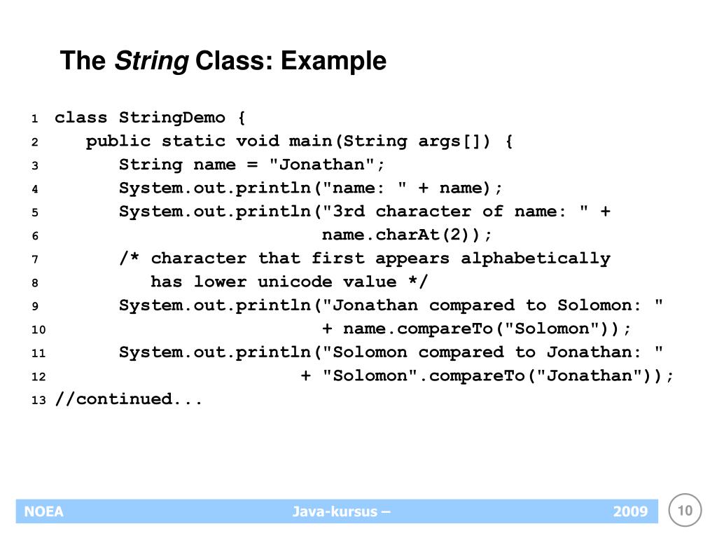 The String Class: Example /* 'J' has lower unicode value compared to 'j' */ System.out.println("Jonathan compared to jonathan: " + name.compareTo("jonathan")); System.out.println("Jonathan compared to jonathan (ignore case): " + name.compareToIgnoreCase("jonathan")); System.out.println("Is Jonathan equal to Jonathan? " + name.equals("Jonathan")); System.out.println("Is Jonathan equal to jonathan? " + name.equals("jonathan")); System.out.println("Is Jonathan equal to jonathan (ignore case)? " + name.equalsIgnoreCase("jonathan")); //continued...