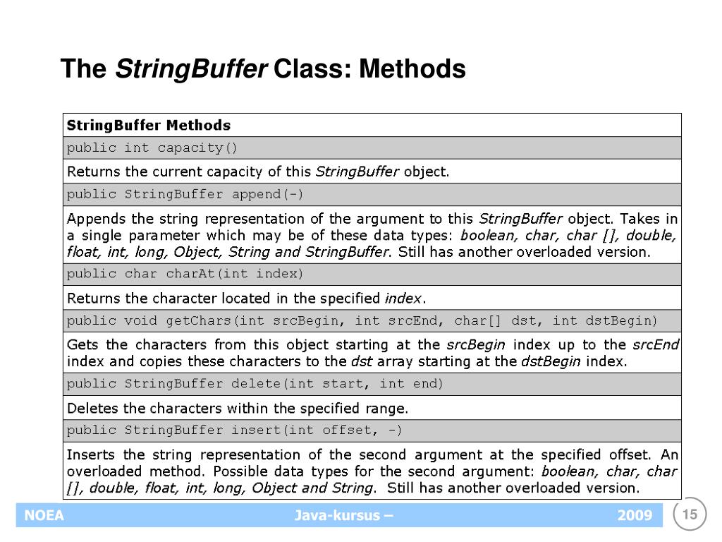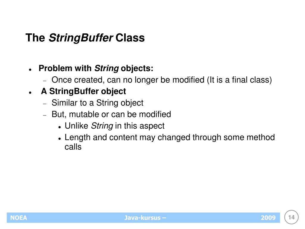 The StringBuffer Class Problem with String objects: Once created, can no longer be modified (It is a final class) A StringBuffer object Similar to a String object But, mutable or can be modified Unlike String in this aspect Length and content may changed through some method calls