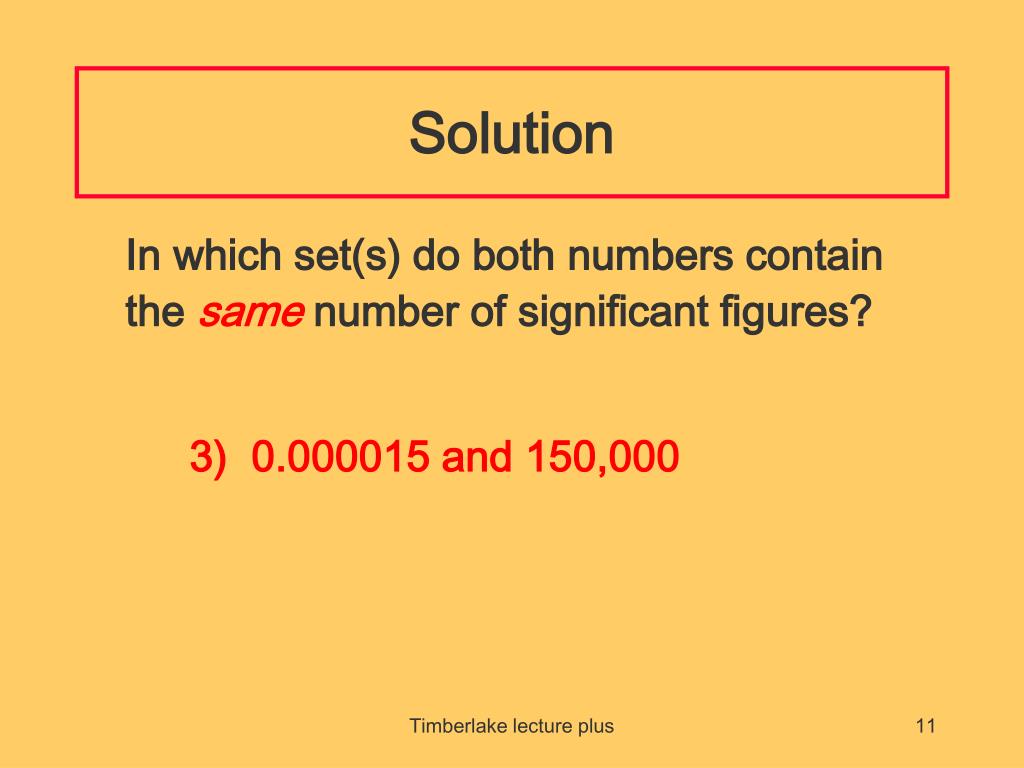 Solution In which set(s) do both numbers contain the same number of significant figures? 3) 0.000015 and 150,000 Timberlake lecture plus