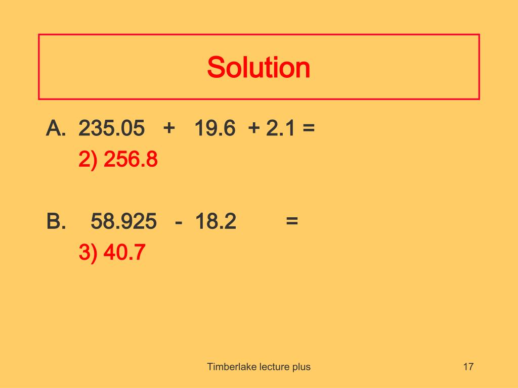 Solution A. 235.05 + 19.6 + 2.1 = 2) 256.8 B. 58.925 - 18.2 = 3) 40.7 Timberlake lecture plus