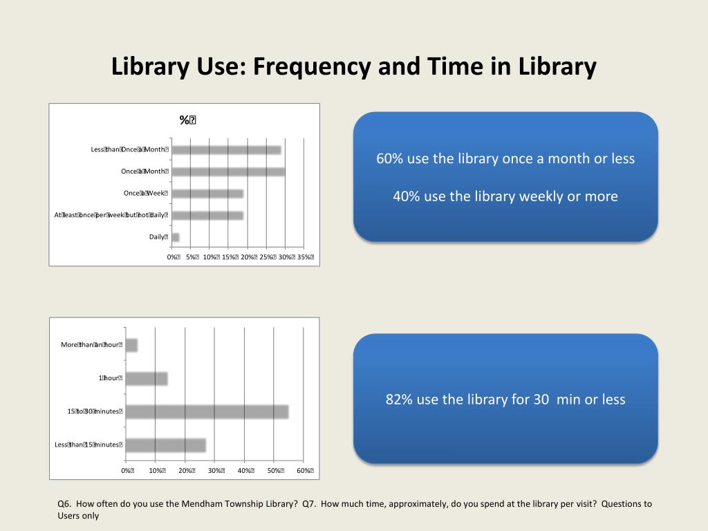 Library Use: Frequency and Time in Library 60% use the library once a month or less 40% use the library weekly or more 82% use the library for 30 min or less Q6. How often do you use the Mendham Township Library? Q7. How much time, approximately, do you spend at the library per visit? Questions to Users only