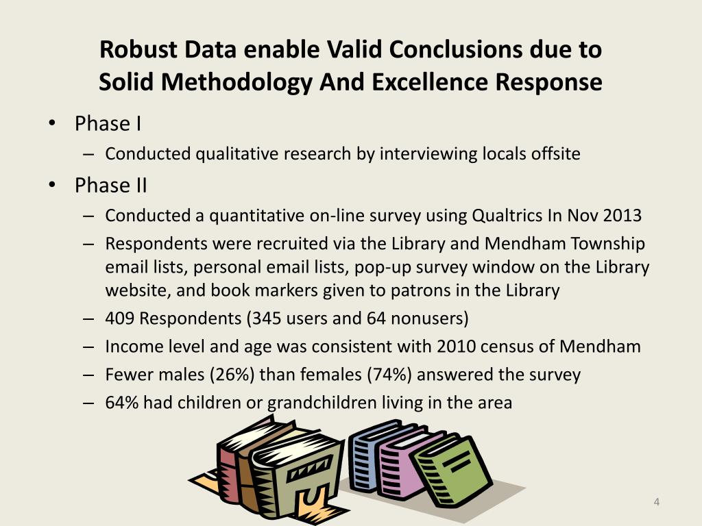 Robust Data enable Valid Conclusions due to Solid Methodology And Excellence Response • Phase I • Conducted qualitative research by interviewing locals offsite • Phase II • Conducted a quantitative on-line survey using Qualtrics In Nov 2013 • Respondents were recruited via the Library and Mendham Township email lists, personal email lists, pop-up survey window on the Library website, and book markers given to patrons in the Library • 409 Respondents (345 users and 64 nonusers) • Income level and age was consistent with 2010 census of Mendham • Fewer males (26%) than females (74%) answered the survey • 64% had children or grandchildren living in the area