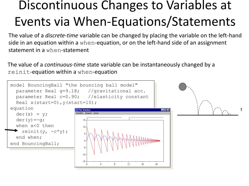 model BouncingBall "the bouncing ball model" parameter Real g=9.18; //gravitational acc. parameter Real c=0.90; //elasticity constant Real x(start=0),y(start=10); equation der(x) = y; der(y)=-g; when x<0 then reinit(y, -c*y); end when; end BouncingBall; Discontinuous Changes to Variables at Events via When-Equations/Statements The value of a discrete-time variable can be changed by placing the variable on the left-hand side in an equation within a when-equation, or on the left-hand side of an assignment statement in a when-statement The value of a continuous-time state variable can be instantaneously changed by a reinit-equation within a when-equation t
