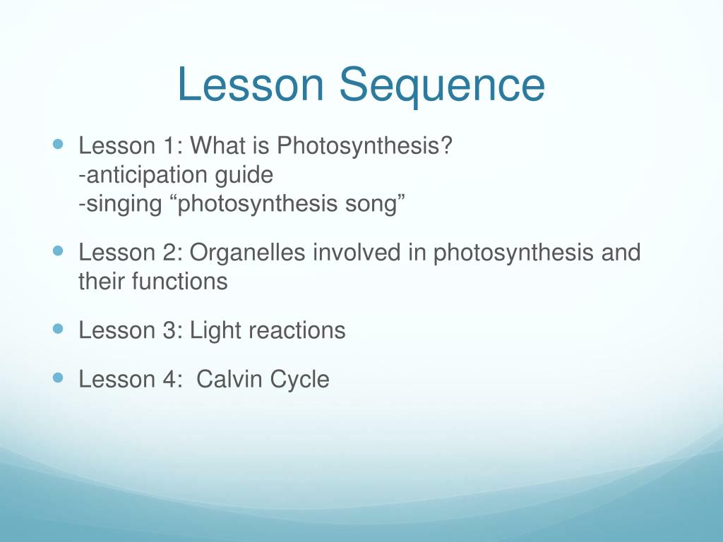 Lesson Sequence • Lesson 1: What is Photosynthesis? -anticipation guide-singing “photosynthesis song” • Lesson 2: Organelles involved in photosynthesis and their functions • Lesson 3: Light reactions • Lesson 4: Calvin Cycle