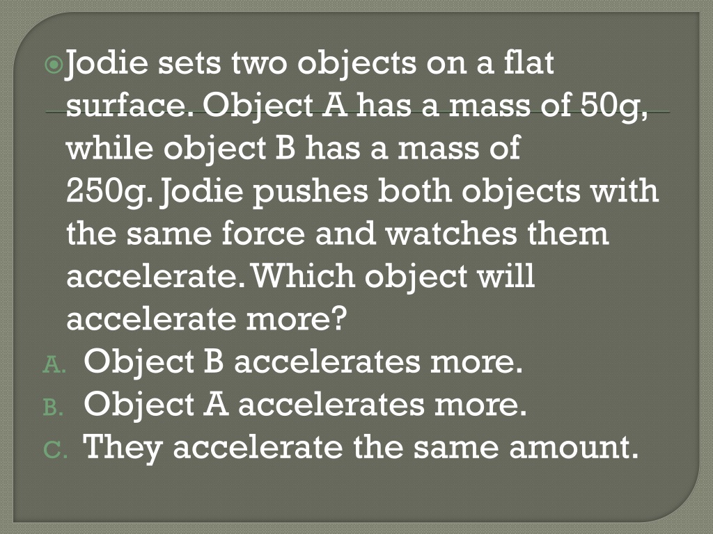 Jodie sets two objects on a flat surface. Object A has a mass of 50g, while object B has a mass of 250g. Jodie pushes both objects with the same force and watches them accelerate. Which object will accelerate more? Object B accelerates more. Object A accelerates more. They accelerate the same amount.