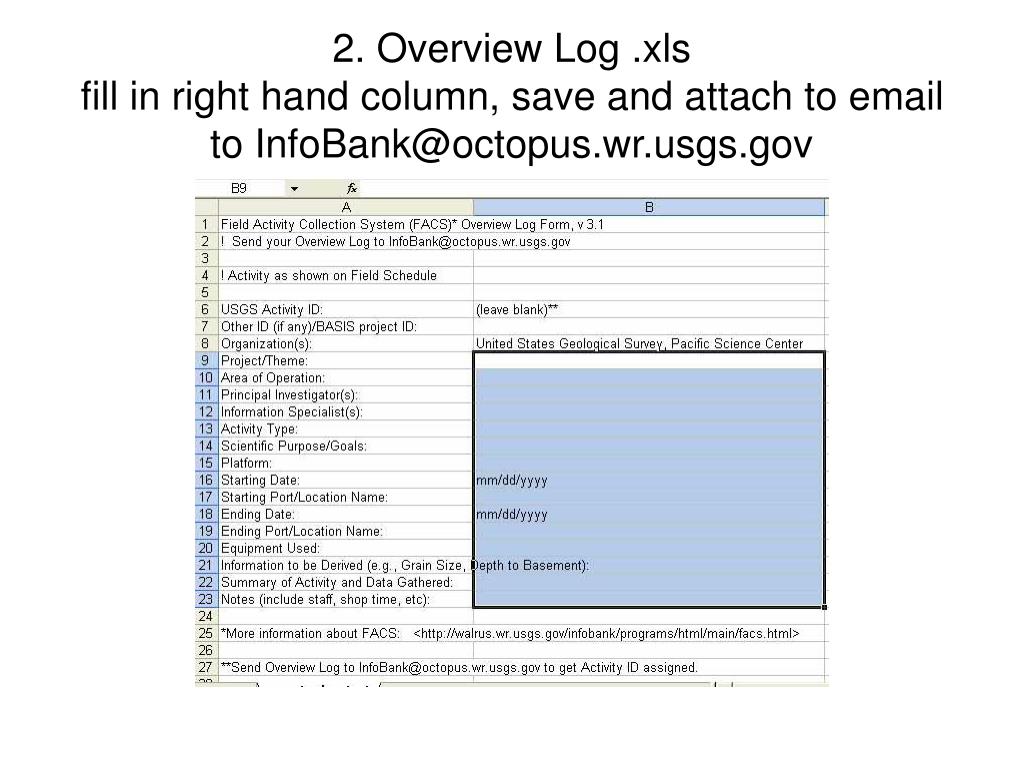 2. Overview Log .xlsfill in right hand column, save and attach to email to InfoBank@octopus.wr.usgs.gov