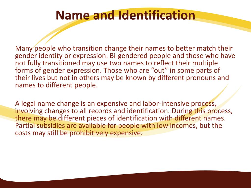 Name and Identification Many people who transition change their names to better match their gender identity or expression. Bi-gendered people and those who have not fully transitioned may use two names to reflect their multiple forms of gender expression. Those who are “out” in some parts of their lives but not in others may be known by different pronouns and names to different people. A legal name change is an expensive and labor-intensive process, involving changes to all records and identification. During this process, there may be different pieces of identification with different names. Partial subsidies are available for people with low incomes, but the costs may still be prohibitively expensive.