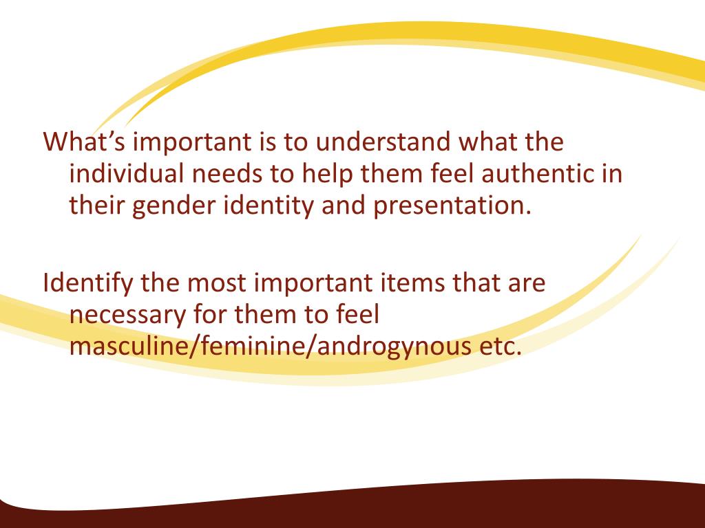 What’s important is to understand what the individual needs to help them feel authentic in their gender identity and presentation. Identify the most important items that are necessary for them to feel masculine/feminine/androgynous etc.
