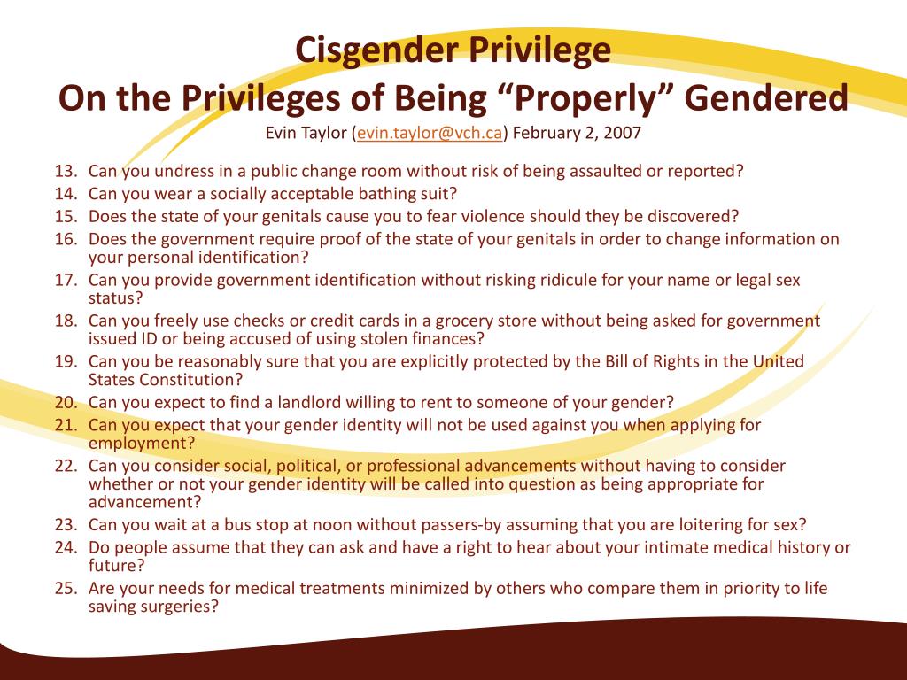 CisgenderPrivilegeOn the Privileges of Being “Properly” GenderedEvin Taylor (evin.taylor@vch.ca) February 2, 2007 1. Can you be guaranteed to find a public bathroom that is safe for you to use? 2. Can you be reasonably sure whether you should check the M or F box on a form? 3. Can you be reasonably sure that your choice of checked box on such forms will not subject you to legal prosecution of fraud or misrepresentation of identity? 4. Can you expect that others will not try to dehumanize you by jokingly or seriously calling you ‘it’? 5. Do people often ask for accolades or think they are doing you a favor for using the appropriate pronouns for your gender? 6. If you are having a difficult time making new friends, can you be generally sure that it is not because of your gender identity? 7. Can you be sure that your gender identity doesn't automatically label you as an outsider, an anomaly, abnormal, or something to be feared? 8. Are you able to discuss your childhood without disguising your gender? 9. Is your gender considered to be a shame on your family? 10. Do people assume that your gender identity is simply your sexual orientation to the extreme? (i.e.: he's so gay that he wants to be a woman) 11. Are incidental parts of your identity defined as a mental illness? 12. Can you expect to find clothes or shoes for sale that are in your size without having to tailor or special order most items?