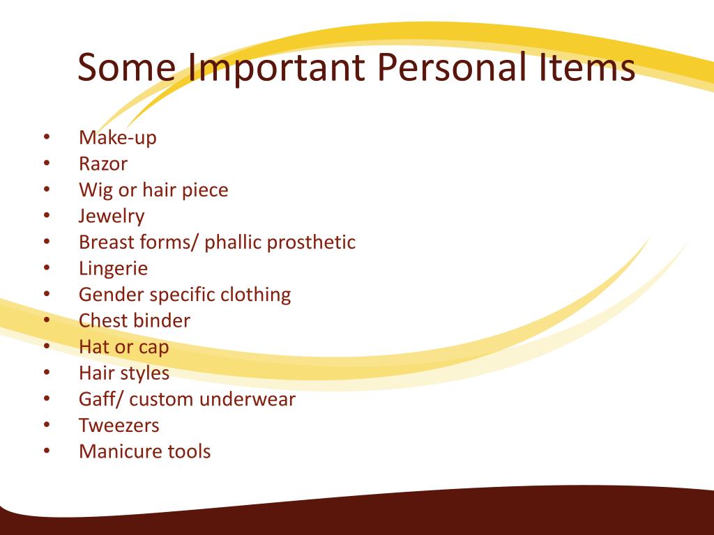 Some Important Personal Items • Make-up • Razor • Wig or hair piece • Jewelry • Breast forms/ phallic prosthetic • Lingerie • Gender specific clothing • Chest binder • Hat or cap • Hair styles • Gaff/ custom underwear • Tweezers • Manicure tools
