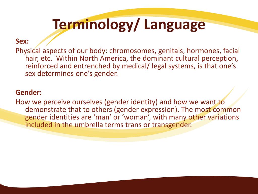 Terminology/ Language Sex: Physical aspects of our body: chromosomes, genitals, hormones, facial hair, etc. Within North America, the dominant cultural perception, reinforced and entrenched by medical/ legal systems, is that one’s sex determines one’s gender. Gender: How we perceive ourselves (gender identity) and how we want to demonstrate that to others (gender expression). The most common gender identities are ‘man’ or ‘woman’, with many other variations included in the umbrella terms trans or transgender.