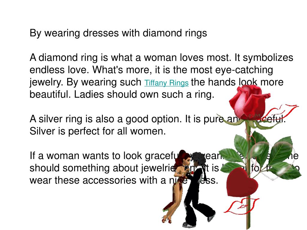 By wearing dresses with diamond rings A diamond ring is what a woman loves most. It symbolizes endless love. What's more, it is the most eye-catching jewelry. By wearing such Tiffany Ringsthe hands look more beautiful. Ladies should own such a ring. A silver ring is also a good option. It is pure and graceful. Silver is perfect for all women. If a woman wants to look graceful by wearing jewelries, she should something about jewelries and it is better for them to wear these accessories with a nice dress.