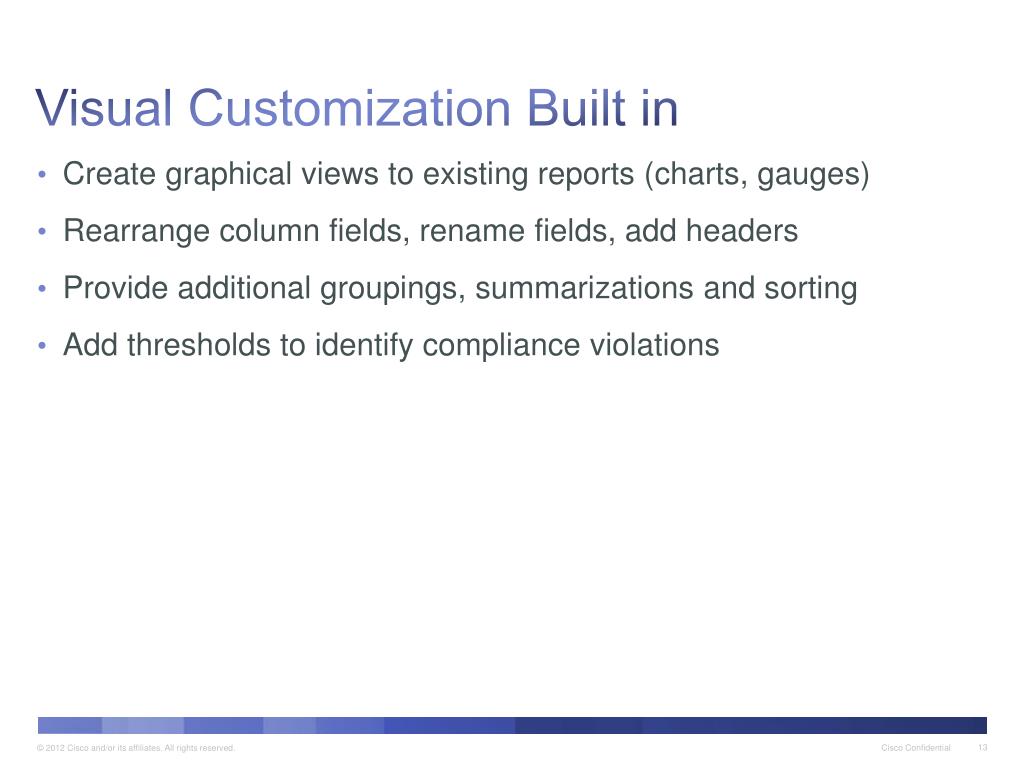 Visual Customization Built in • Create graphical views to existing reports (charts, gauges) • Rearrange column fields, rename fields, add headers • Provide additional groupings, summarizations and sorting • Add thresholds to identify compliance violations