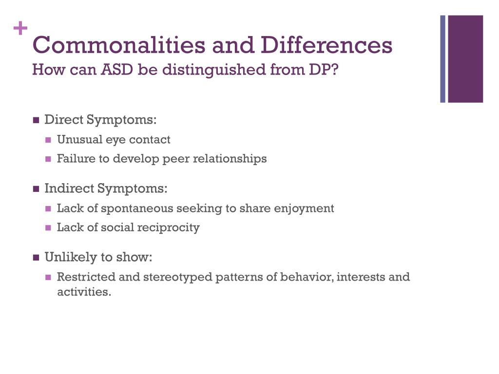 Commonalities and DifferencesHow can ASD be distinguished from DP? • Direct Symptoms: • Unusual eye contact • Failure to develop peer relationships • Indirect Symptoms: • Lack of spontaneous seeking to share enjoyment • Lack of social reciprocity • Unlikely to show: • Restricted and stereotyped patterns of behavior, interests and activities.