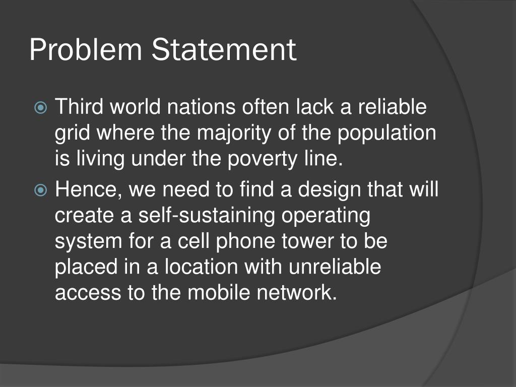 Problem Statement • Third world nations often lack a reliable grid where the majority of the population is living under the poverty line. • Hence, we need to find a design that will create a self-sustaining operating system for a cell phone tower to be placed in a location with unreliable access to the mobile network.