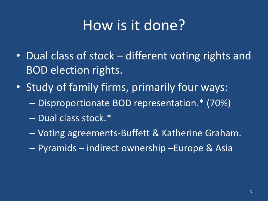 How is it done? • Dual class of stock – different voting rights and BOD election rights. • Study of family firms, primarily four ways: • Disproportionate BOD representation.* (70%) • Dual class stock.* • Voting agreements-Buffett & Katherine Graham. • Pyramids – indirect ownership –Europe & Asia