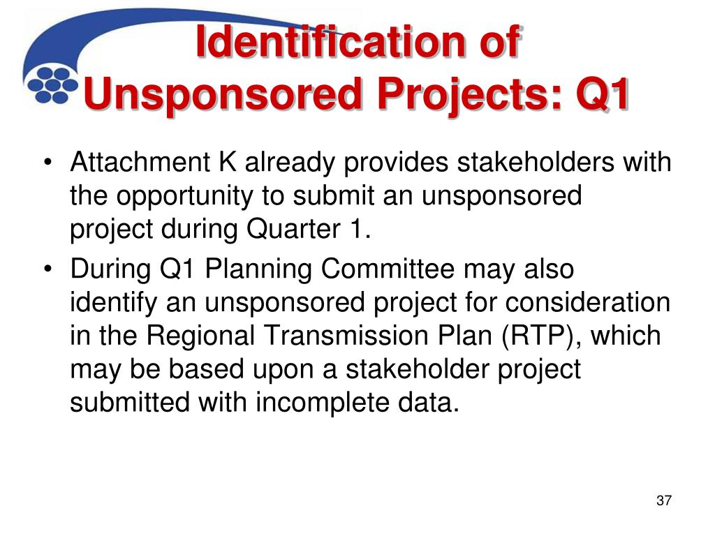 Identification of Unsponsored Projects: Q1 • Attachment K already provides stakeholders with the opportunity to submit an unsponsored project during Quarter 1. • During Q1 Planning Committee may also identify an unsponsored project for consideration in the Regional Transmission Plan (RTP), which may be based upon a stakeholder project submitted with incomplete data.