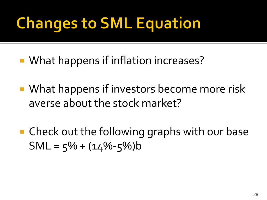 Changes to SML Equation • What happens if inflation increases? • What happens if investors become more risk averse about the stock market? • Check out the following graphs with our base SML = 5% + (14%-5%)b