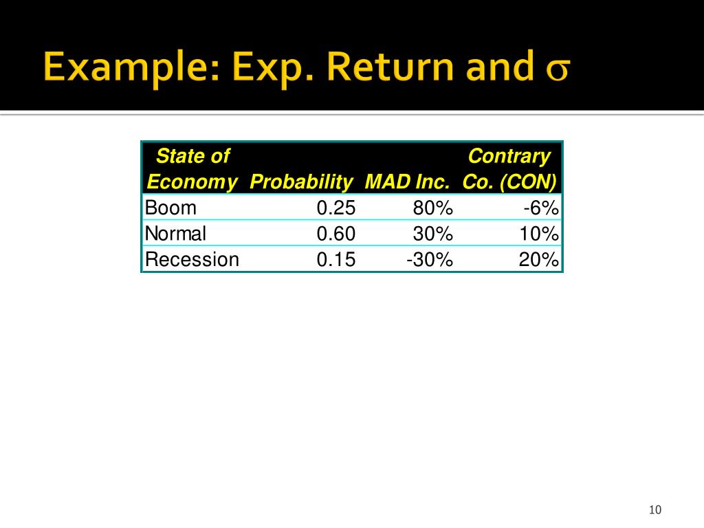 Portfolio Risk and Return • E(rp) = wiE(ri) = weighted average of the expected return of each asset in the portfolio • In our example, MAD E(r) = 33.5% and CON E(r) = 7.5% • What is the expected return of a portfolio consisting of 60% MAD and 40% CON? • E(rp) = wiE(ri) = .6(33.5%) + .4(7.5%) = 23.1%
