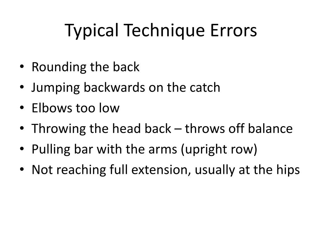 Typical Technique Errors • Rounding the back • Jumping backwards on the catch • Elbows too low • Throwing the head back – throws off balance • Pulling bar with the arms (upright row) • Not reaching full extension, usually at the hips