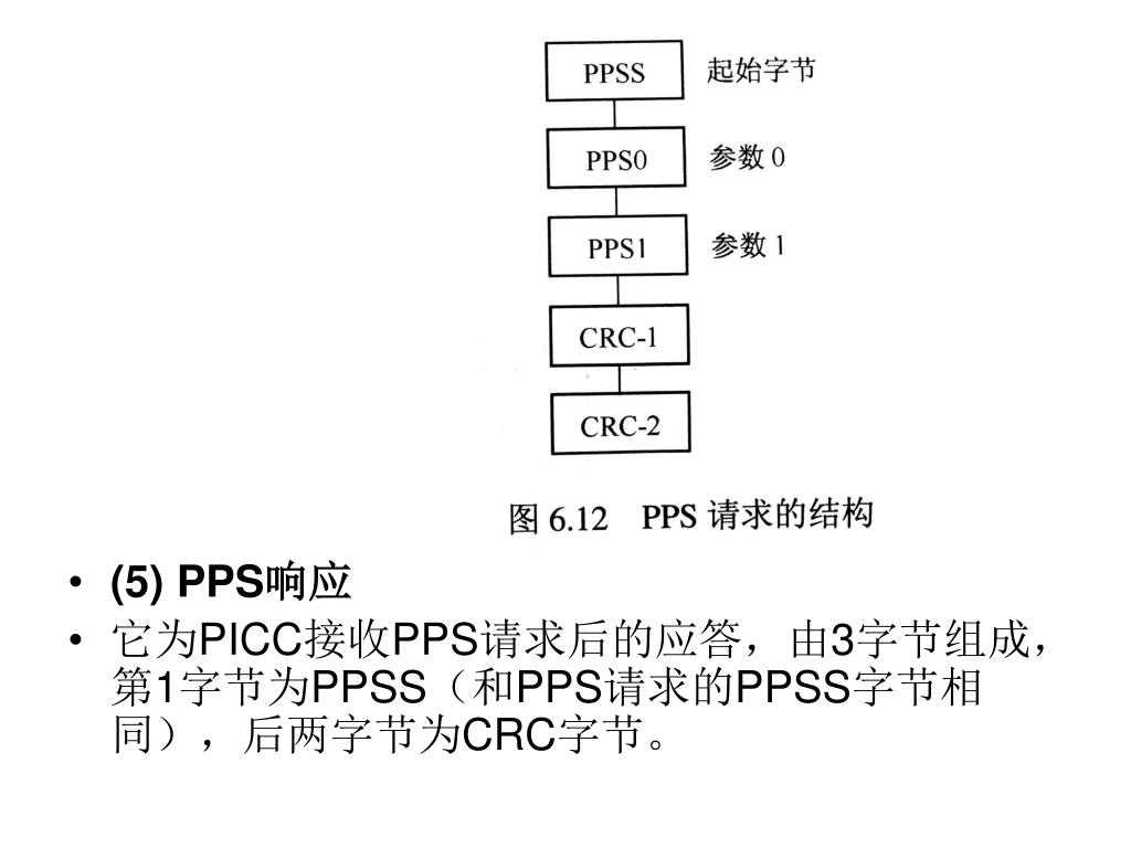 (5) PPS响应 • 它为PICC接收PPS请求后的应答,由3字节组成,第1字节为PPSS(和PPS请求的PPSS字节相同),后两字节为CRC字节。