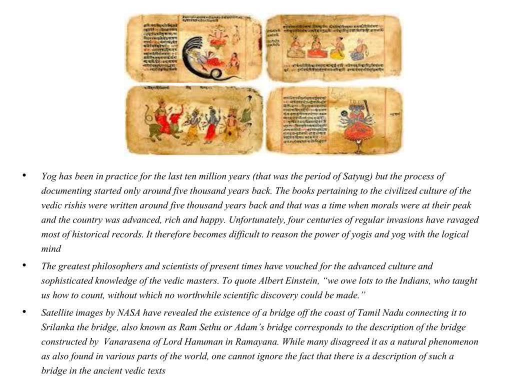 Yog has been in practice for the last ten million years (that was the period of Satyug) but the process of documenting started only around five thousand years back. The books pertaining to the civilized culture of the vedicrishis were written around five thousand years back and that was a time when morals were at their peak and the country was advanced, rich and happy. Unfortunately, four centuries of regular invasions have ravaged most of historical records. It therefore becomes difficult to reason the power of yogis and yog with the logical mind The greatest philosophers and scientists of present times have vouched for the advanced culture and sophisticated knowledge of the vedicmasters. To quote Albert Einstein, “we owe lots to the Indians, who taught us how to count, without which no worthwhile scientific discovery could be made.” Satellite images by NASA have revealed the existence of a bridge off the coast of Tamil Nadu connecting it to Srilanka the bridge, also known as Ram Sethu or Adam’s bridge corresponds to the description of the bridge constructed by Vanarasenaof Lord Hanuman in Ramayana. While many disagreed it as a natural phenomenon as also found in various parts of the world, one cannot ignore the fact that there is a description of such a bridge in the ancient vedic texts