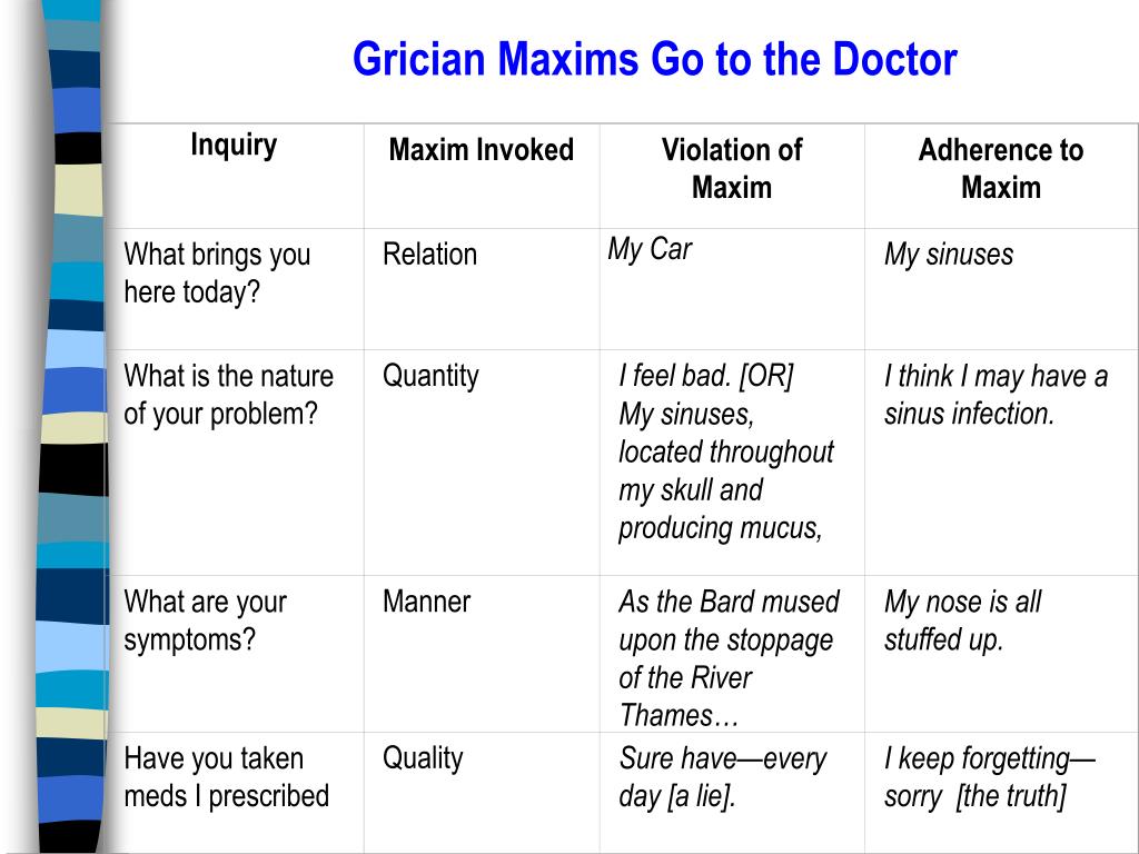 Inquiry Maxim Invoked Violation of Maxim Adherence to Maxim What brings you here today? Relation My Car My sinuses What is the nature of your problem? Quantity I feel bad. [OR] My sinuses, located throughout my skull and producing mucus, I think I may have a sinus infection. What are your symptoms? Manner As the Bard mused upon the stoppage of the River Thames… My nose is all stuffed up. Have you taken meds I prescribed Quality Sure have—every day [a lie]. I keep forgetting—sorry [the truth] Grician Maxims Go to the Doctor